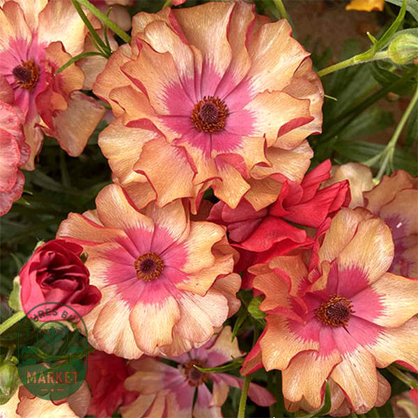 In cultivation, the Persian buttercup (Ranunculus asiaticus) has been developed into spectacular garden flowers with densely layered, papery petals that create full, rose-like blooms in vibrant colors including pink, red, orange, yellow, and white. These cultivated varieties are popular in wedding bouquets and floral arrangements for their romantic, ruffled appearance and long-lasting blooms.