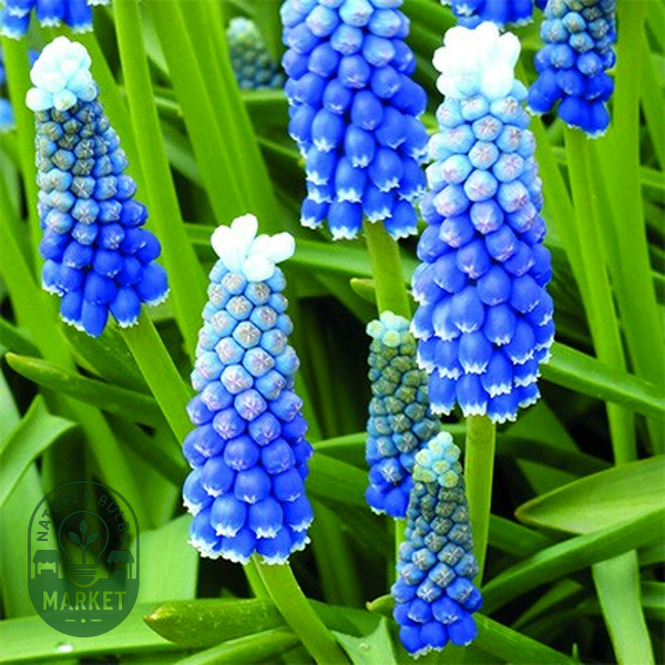 These charming spring flowers are native to the Mediterranean region and parts of Asia. They're characterized by their distinctive clusters of small, bell-shaped or urn-shaped flowers that resemble tiny grapes, hence the common name "grape hyacinth." The flowers typically come in shades of blue, purple, white, or yellow, and grow on short spikes above grass-like foliage.