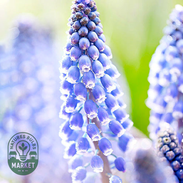 These charming spring flowers are native to the Mediterranean region and parts of Asia. They're characterized by their distinctive clusters of small, bell-shaped or urn-shaped flowers that resemble tiny grapes, hence the common name "grape hyacinth." The flowers typically come in shades of blue, purple, white, or yellow, and grow on short spikes above grass-like foliage.