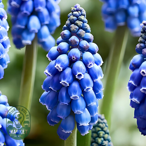 These charming spring flowers are native to the Mediterranean region and parts of Asia. They're characterized by their distinctive clusters of small, bell-shaped or urn-shaped flowers that resemble tiny grapes, hence the common name "grape hyacinth." The flowers typically come in shades of blue, purple, white, or yellow, and grow on short spikes above grass-like foliage.