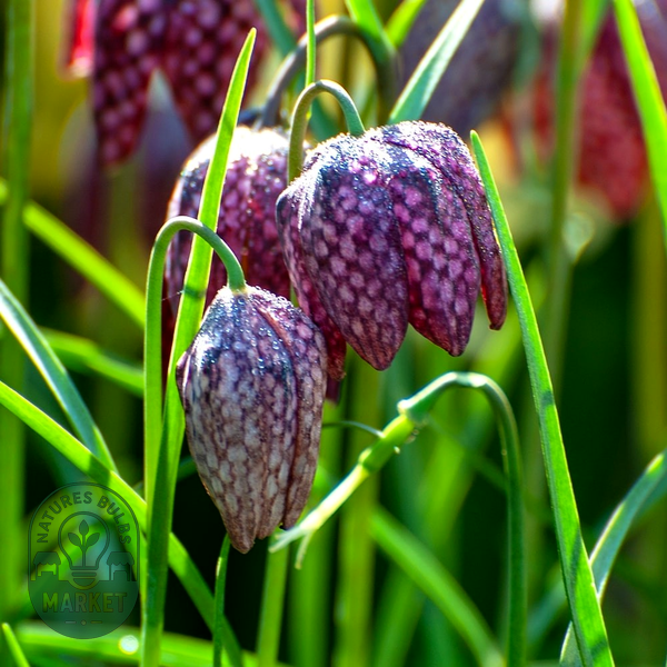 Fritillaria is a genus of bulbous flowering plants known for their distinctive drooping, bell-shaped flowers that often display intricate checkered or spotted patterns. The name comes from the Latin "fritillus," meaning dice box, referring to the checkered pattern resembling a Roman dice cup found on many species.