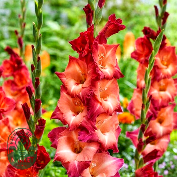 Native primarily to South Africa, with some species from the Mediterranean region, gladioli have become popular garden plants worldwide. They bloom in summer and are prized as cut flowers due to their impressive height and long-lasting blooms. The plants prefer full sun and well-drained soil, and in colder climates, the corms must be lifted and stored indoors during winter. Gladioli are excellent for creating dramatic vertical elements in flower gardens and are commonly grown in rows for cutting. There are over 260 species and countless cultivars, ranging from miniature varieties to giant exhibition types.