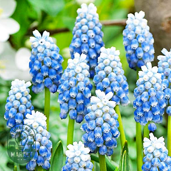 These charming spring flowers are native to the Mediterranean region and parts of Asia. They're characterized by their distinctive clusters of small, bell-shaped or urn-shaped flowers that resemble tiny grapes, hence the common name "grape hyacinth." The flowers typically come in shades of blue, purple, white, or yellow, and grow on short spikes above grass-like foliage.
