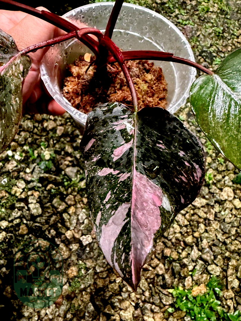 The Philodendron Pink Princess with Deep Pink & Galaxy Variegation is an extraordinary selection of the iconic Pink Princess, showcasing intensely saturated deep pink variegation combined with stunning galaxy-style patterns that create a cosmic effect across the dark green and burgundy foliage. This premium selection features bold splashes, sectoral blocks, and speckled patterns of vibrant bubble-gum pink that appear to shimmer across each glossy, heart-shaped leaf. Each leaf is a unique work of art, making this one of the most coveted and visually striking philodendrons available.
