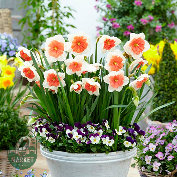 The classic narcissus flower features six outer petals (technically tepals) surrounding a central corona or "trumpet" that can be short like a cup or long and flared. This unique structure creates their instantly recognizable silhouette. Colors range from pure white and sunny yellow to combinations of cream, orange, pink, and even green, with many varieties featuring contrasting coronas that add visual interest.