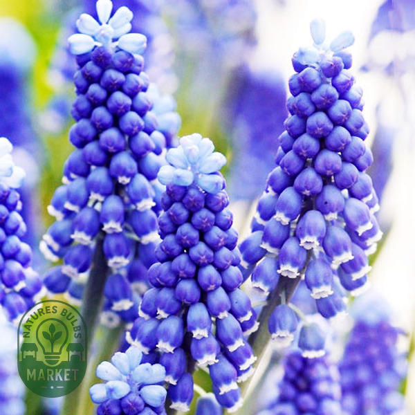 These charming spring flowers are native to the Mediterranean region and parts of Asia. They're characterized by their distinctive clusters of small, bell-shaped or urn-shaped flowers that resemble tiny grapes, hence the common name "grape hyacinth." The flowers typically come in shades of blue, purple, white, or yellow, and grow on short spikes above grass-like foliage.