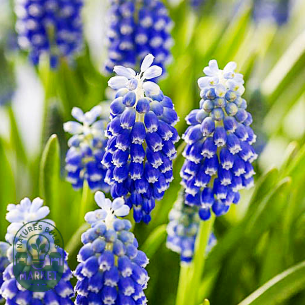 These charming spring flowers are native to the Mediterranean region and parts of Asia. They're characterized by their distinctive clusters of small, bell-shaped or urn-shaped flowers that resemble tiny grapes, hence the common name "grape hyacinth." The flowers typically come in shades of blue, purple, white, or yellow, and grow on short spikes above grass-like foliage.
